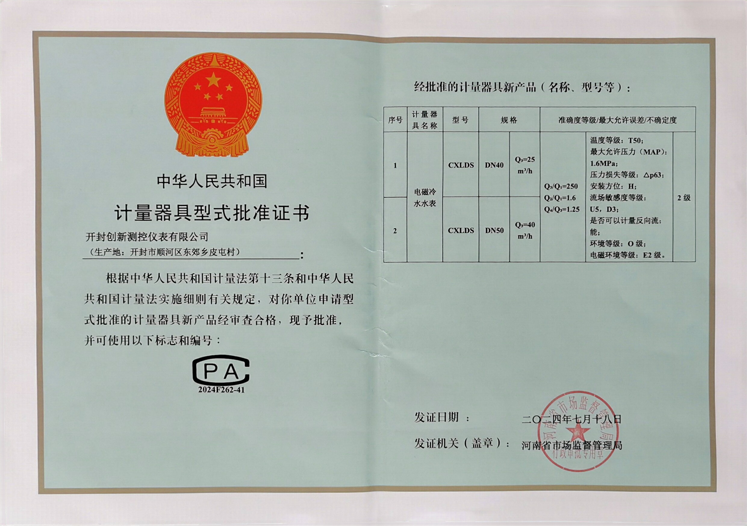 電磁水表型批證書